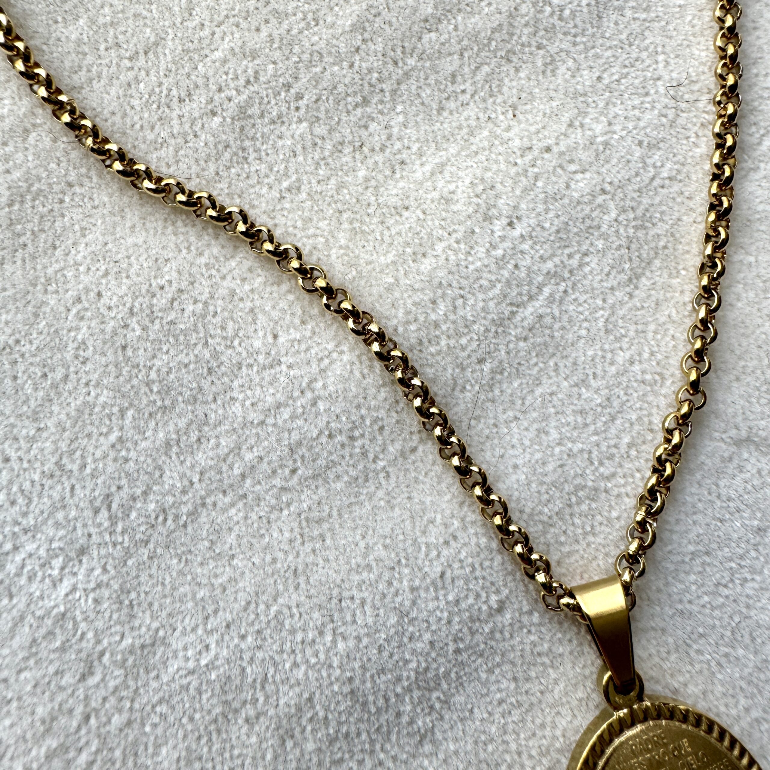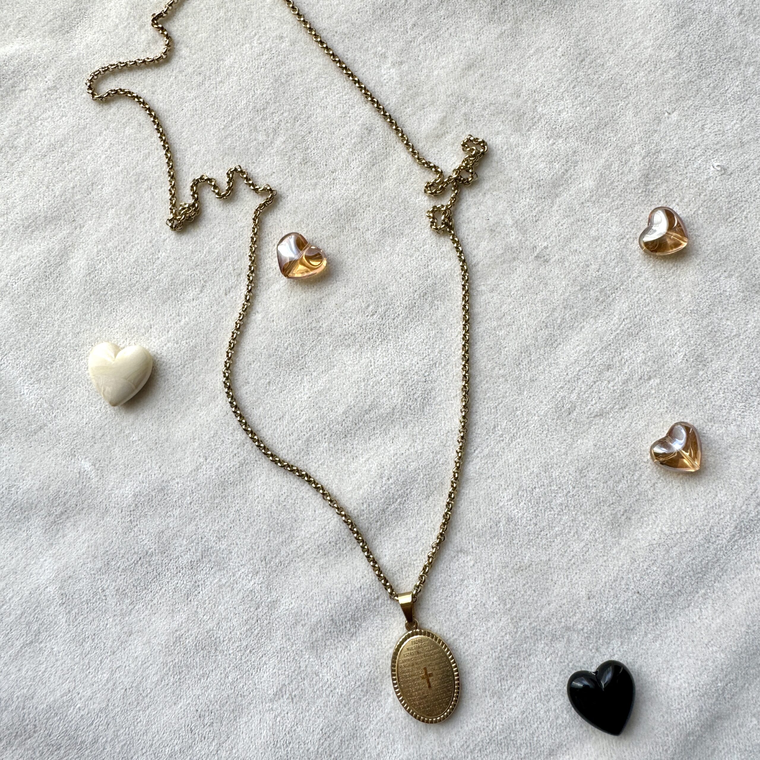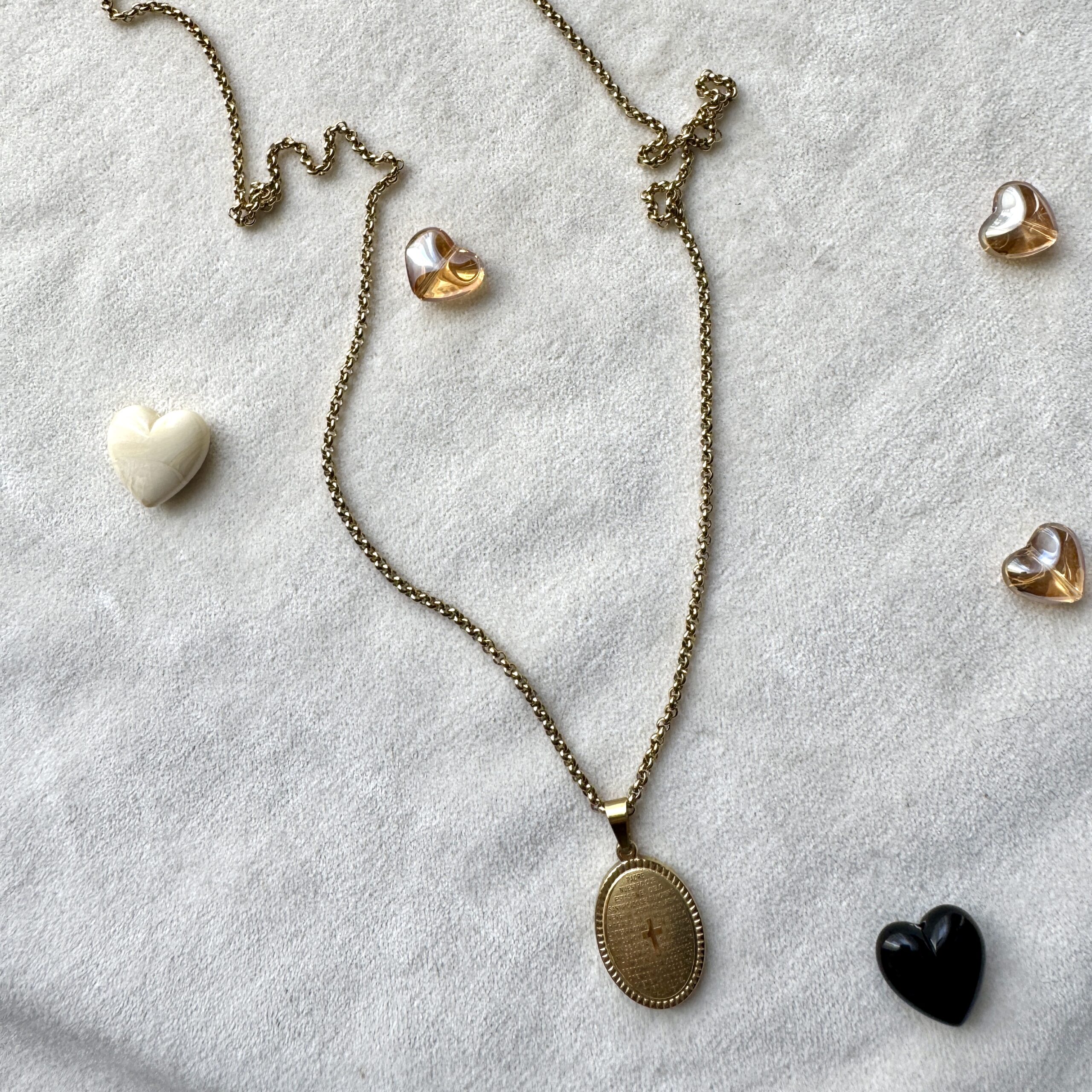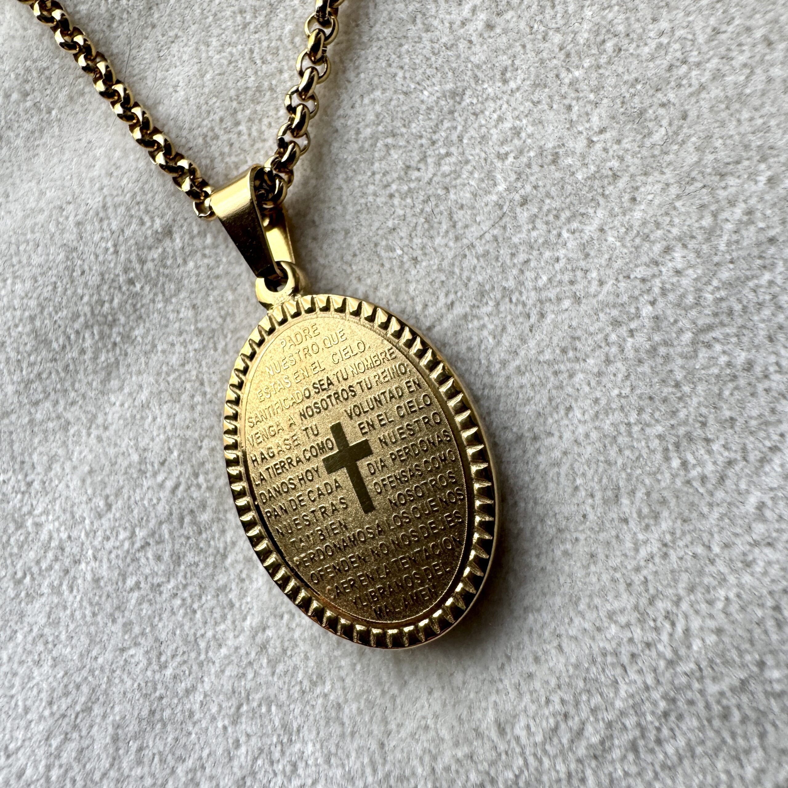 Affirmez votre foi et votre élégance avec ce magnifique collier médaillon doré. Son pendentif ovale finement poli est orné d’une croix délicatement gravée au centre, entourée d’un texte finement ciselé pour une touche spirituelle et raffinée.Un bijou intemporel qui allie symbolisme, style et finesse — parfait pour un usage quotidien ou comme cadeau empreint de…